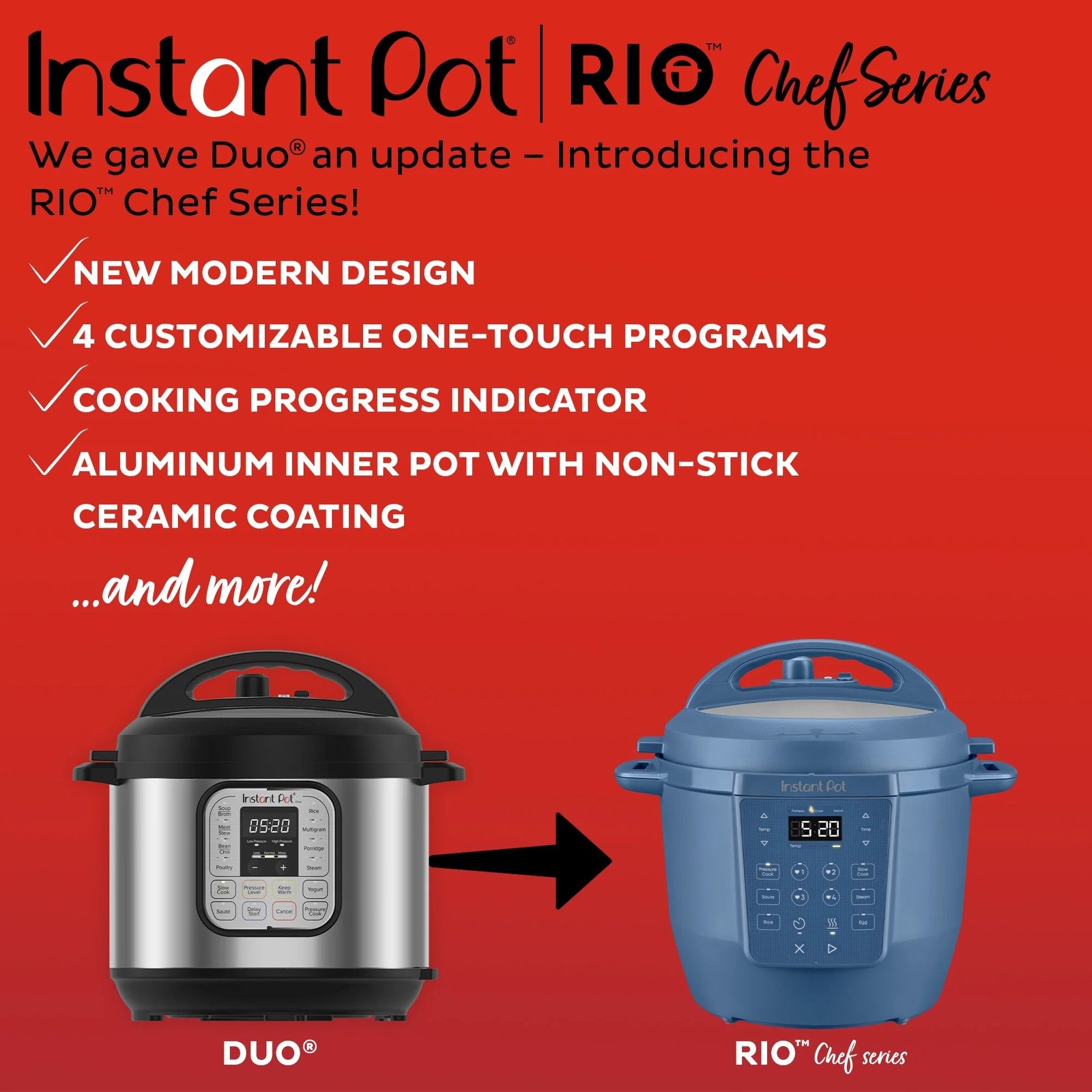 The Instant Pot® RIO™ Chef Series 6QT Multi-Cooker is a must-have for effortless, stress-free cooking—available exclusively at Walmart. Combining sleek design with powerful functionality, it features 7 cooking functions and 4 customizable presets to save your favorite settings. The non-stick, ceramic-coated aluminum pot ensures even cooking and easy cleanup, while the slim design fits perfectly on your countertop without sacrificing capacity. Big enough to serve six or leave plenty for leftovers, it’s perfect for families or meal preppers. The Easy-Release steam switch makes venting hassle-free, and when you’re done, both the lid and cooking pot are dishwasher-safe. Get ready to redefine dinner with this chef-worthy appliance.